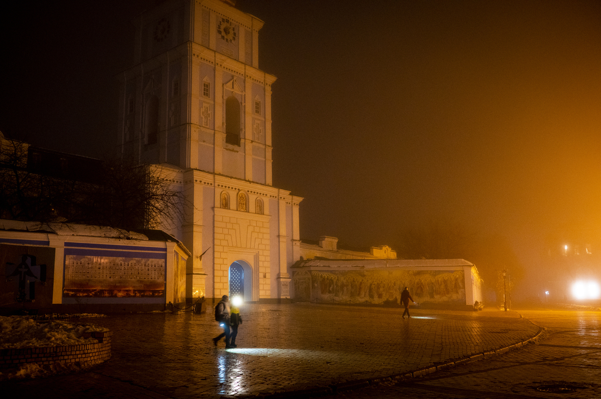People use headlamps and flashlights as they pass St. Michael's Golden-Domed Monastery during a power outage in Kyiv on Dec. 10. Pete Kiehart for NPR hide caption
