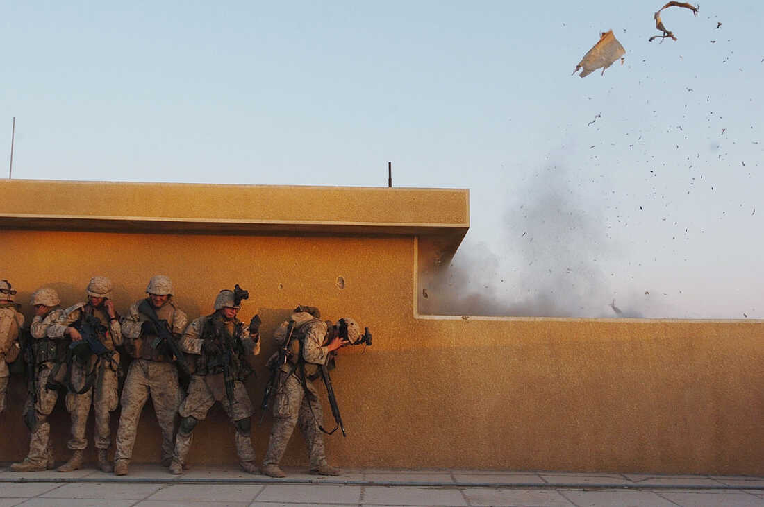 Nov. 22, 2004: U.S. Marines use explosives to open rooftop doors as they search houses for insurgents on in Fallujah, Iraq. Scott Peterson/Getty Images hide caption