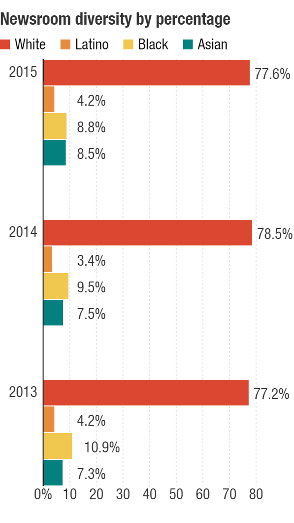 Overall, the newsroom staff remains overwhelming white (77.6 percent). The rest of the newsroom staff is 8.8 percent African-American, 8.5 percent Asian, just 4.2 percent Latino and 0.8 percent people who say they are two or more races. (For comparison, the Radio Television Digital News Association has numbers from the broader journalism world.)