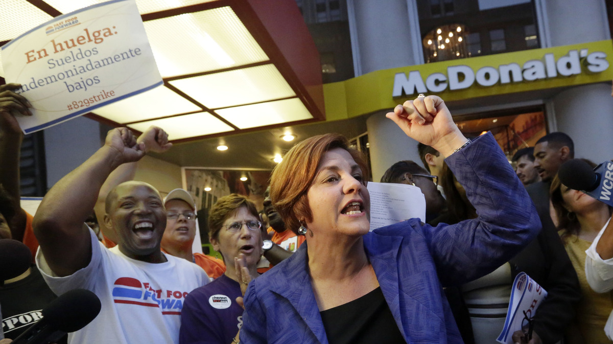 New York City Council speaker and then-mayoral candidate Christine Quinn speaks at a fast-food workers' protest outside a McDonald's in New York in August. A nationwide movement is calling for raising the minimum hourly wage for fast-food workers to $15.