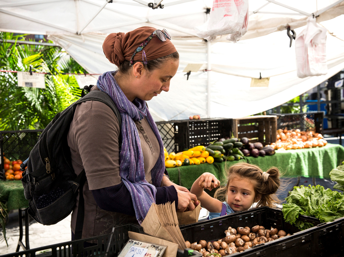 A woman and her daughter shop at a Greenmarket in New York City using Electronic Benefits Transfer, or food stamps. Government data show that fewer people were receiving the benefits in February 2014 than at the peak in December 2012.