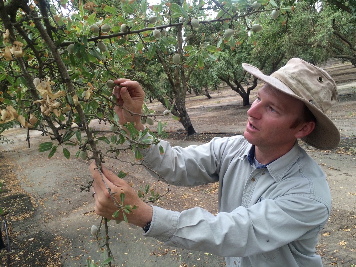 David Doll of the University of California Division of Agriculture and Natural Resources, examines an almond tree. High almond prices prompted many California growers to put in new plantings of the nut tree in recent years. But those prices have now fallen about 20 percent.