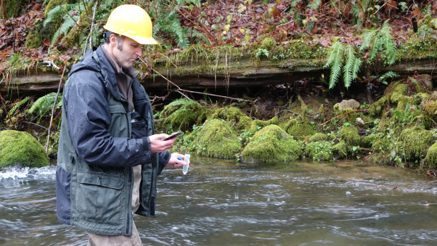 Biologist Shaun Clements counts down the seconds before emptying a vial of synthetic DNA into a stream near Alsea, Oregon.