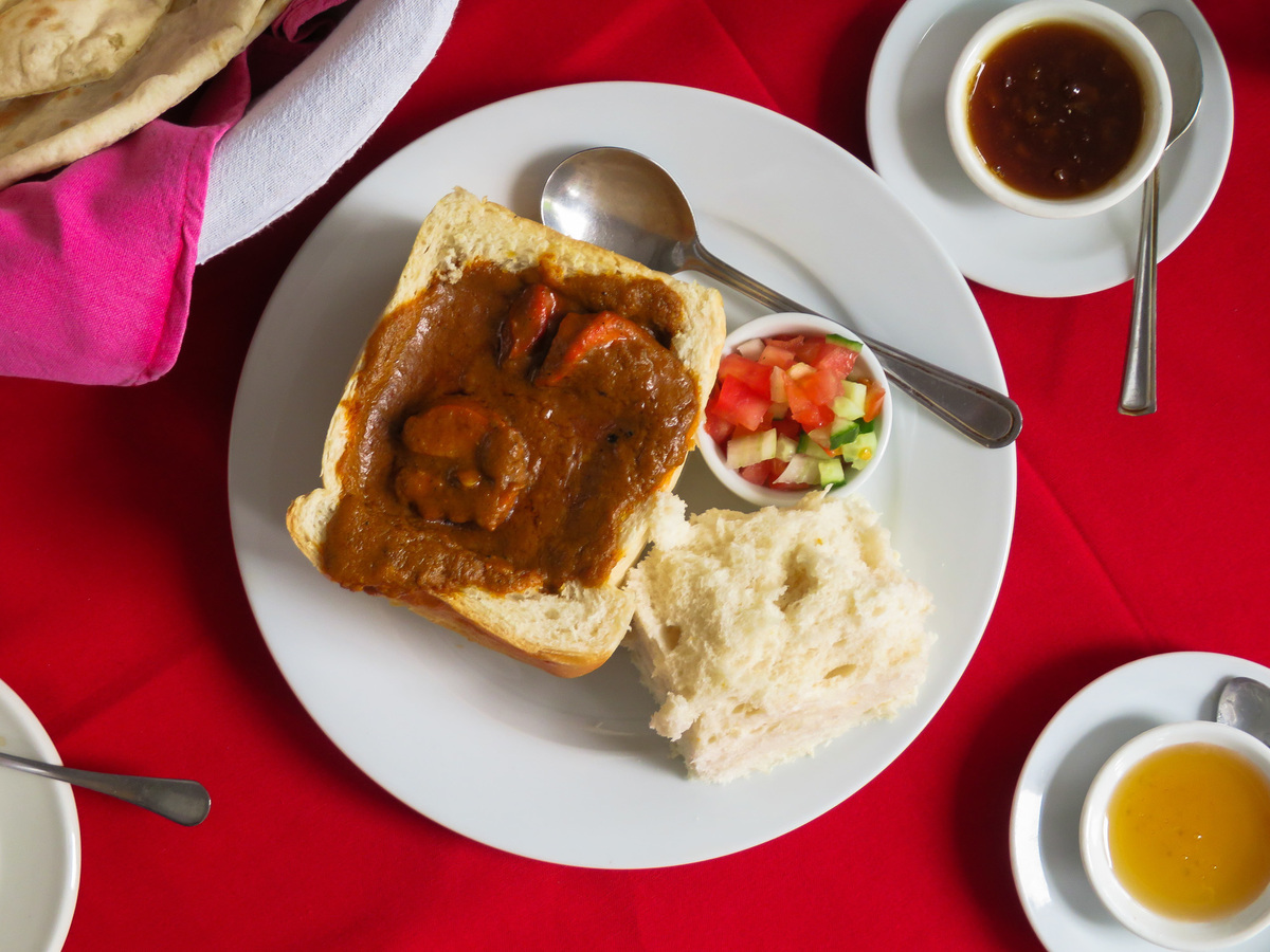 In South Africa, curries are contained within the bread loaf. At Amawele, the meat and sauce are served overflowing the sides. Nevertheless, it's become a popular item.