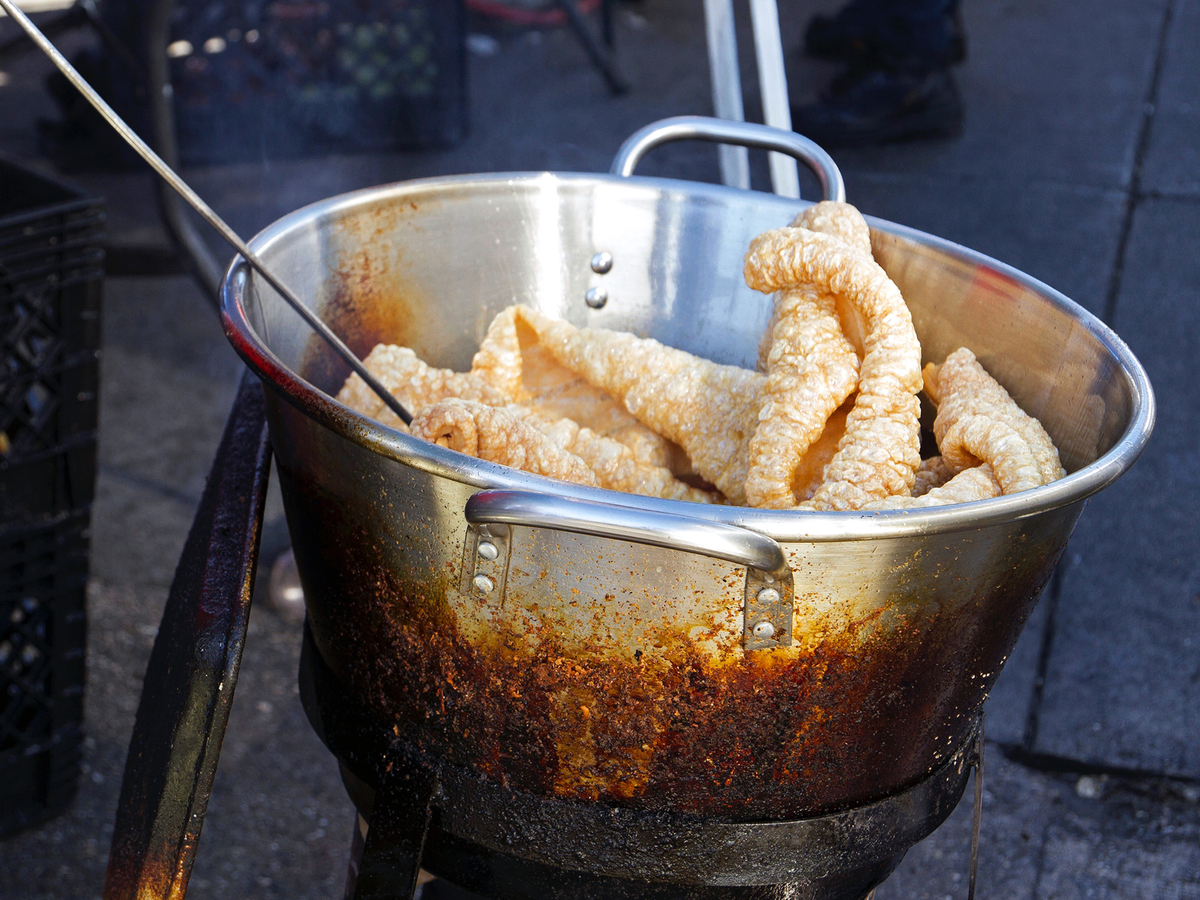 Chicharrones, or pork rinds, fry in the piñata district in Los Angeles.