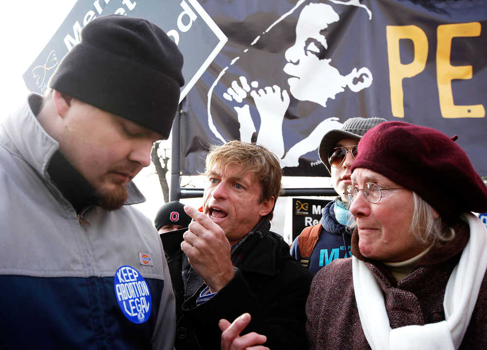 Pro-life activist Michael Voris (2nd-L) of Detroit, Michigan, argues with local pro-choice activist Geoff Millard (L). Alex Wong/Getty Images hide caption
