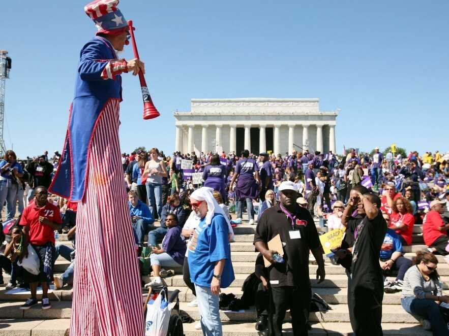 NPR's Allison Keyes reported for Weekend Edition Sunday, meanwhile, that Saturday's "diverse crowd of activists filled the steps of the Lincoln Memorial and lined the reflecting pool in rows nearly all the way to the Washington Monument." Among the speakers at the "One Nation" rally was one of Beck's broadcasting rivals from the liberal side -- MSNBC's Ed Schultz.