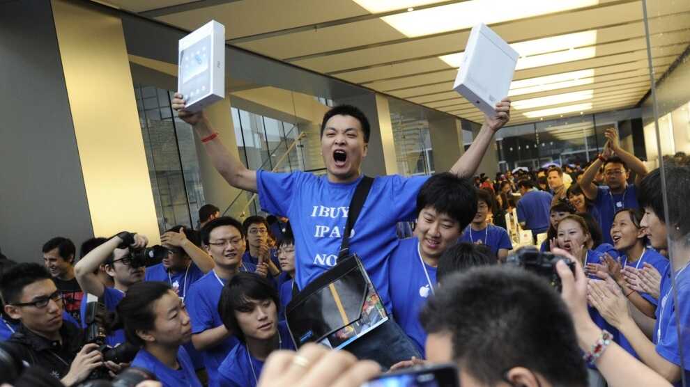 Apple customer Han Ziwen shouts holding his ipads outside Apple's flagship store in Beijing after queuing for 60 hours to be one of the first to officially buy an iPad in China. PETER PARKS/AFP/Getty Images/AFP hide caption
