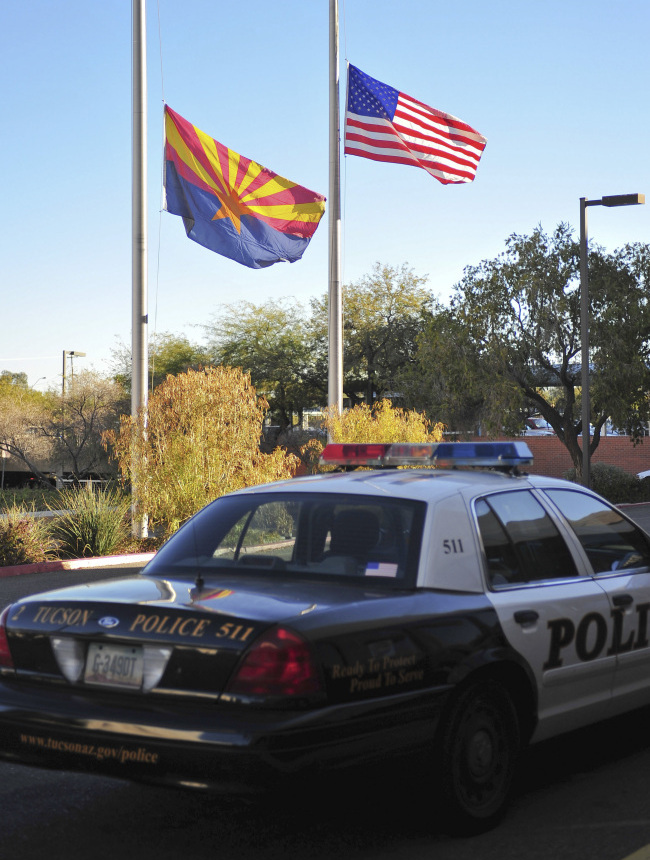 Flags fly at half-mast outside University Medical Center in Tucson where Rep. Gabrielle Giffords and other victims were being treated after being shot today.