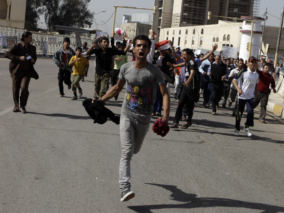 Protesters run as they chant anti-Iraqi government slogans during a protest in Baghdad's Tahrir Square. Hundreds of demonstrators converged on central Baghdad as part of a rally inspired by uprisings across the Middle East and dubbed the "Day of Rage."