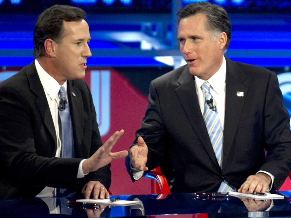 Back in their sparring days: Rick Santorum (left) and Mitt Romney during a Feb. 22, 2012, Republican presidential debate in Arizona.