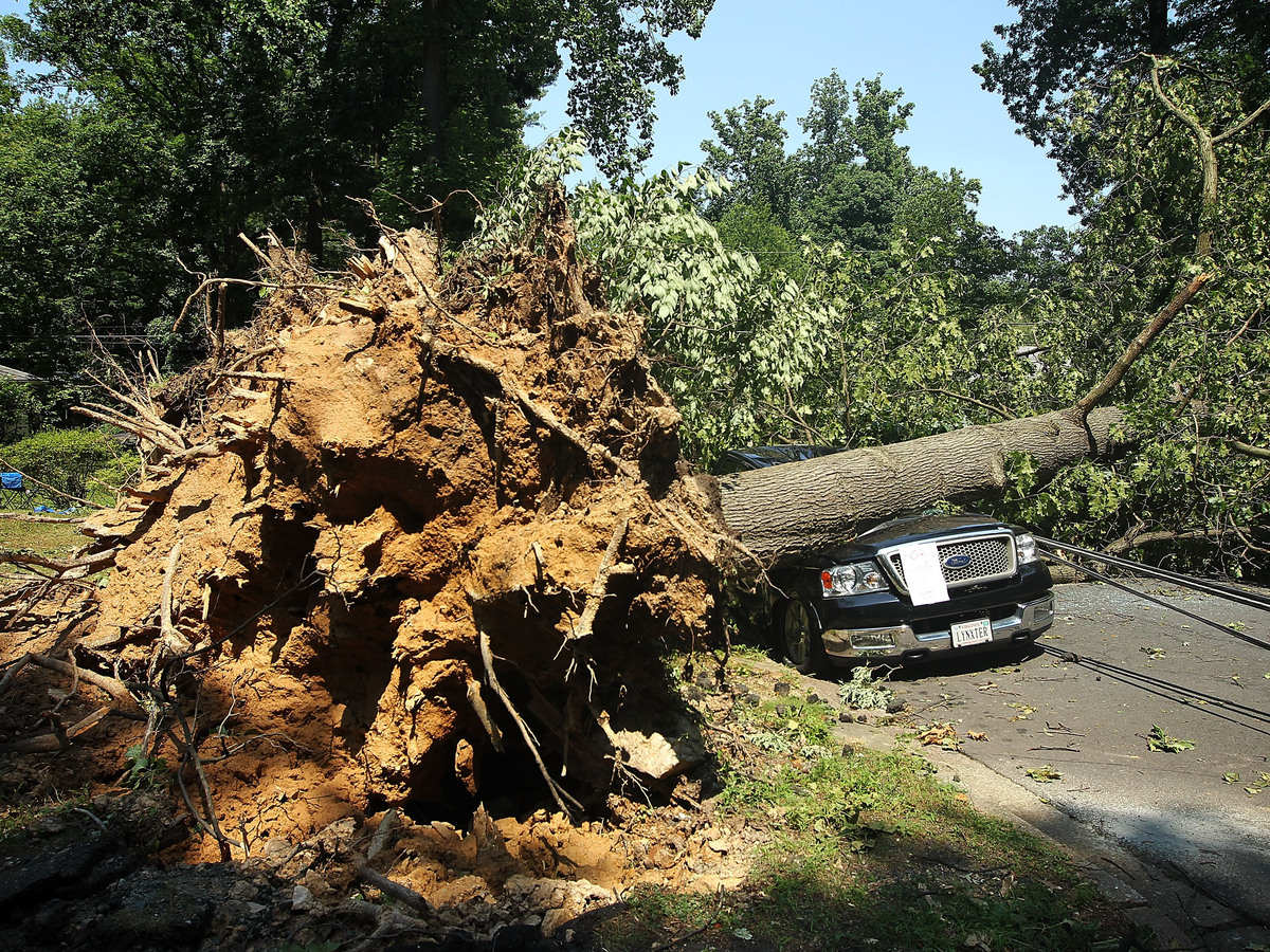 A downed tree lies on a truck in Falls Church, Va., after a powerful storm struck the area on Friday. Alex Wong/Getty Images hide caption