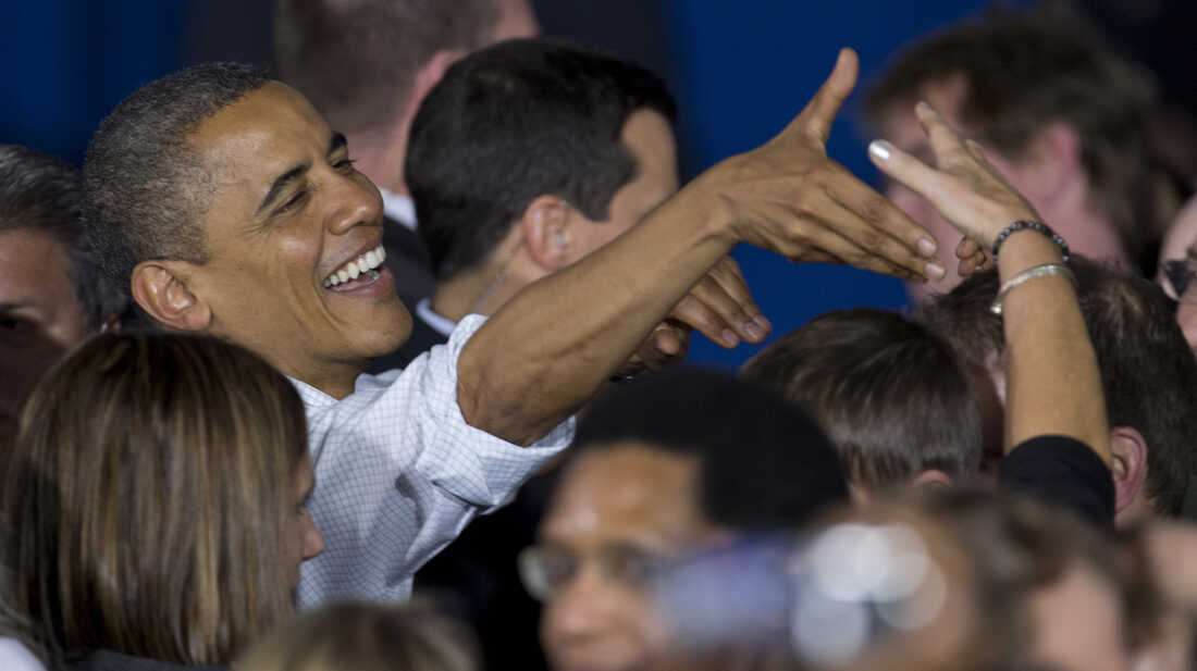 President Obama greets audience members Saturday after speaking at a campaign event at Mentor High School in Mentor, Ohio, before traveling to Milwaukee for another campaign event. Carolyn Kaster/AP hide caption