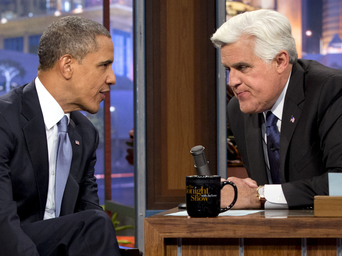 President Obama talks with Jay Leno during the taping of his appearance on The Tonight Show with Jay Leno. Obama told Leno: "We don't have a domestic spying program."