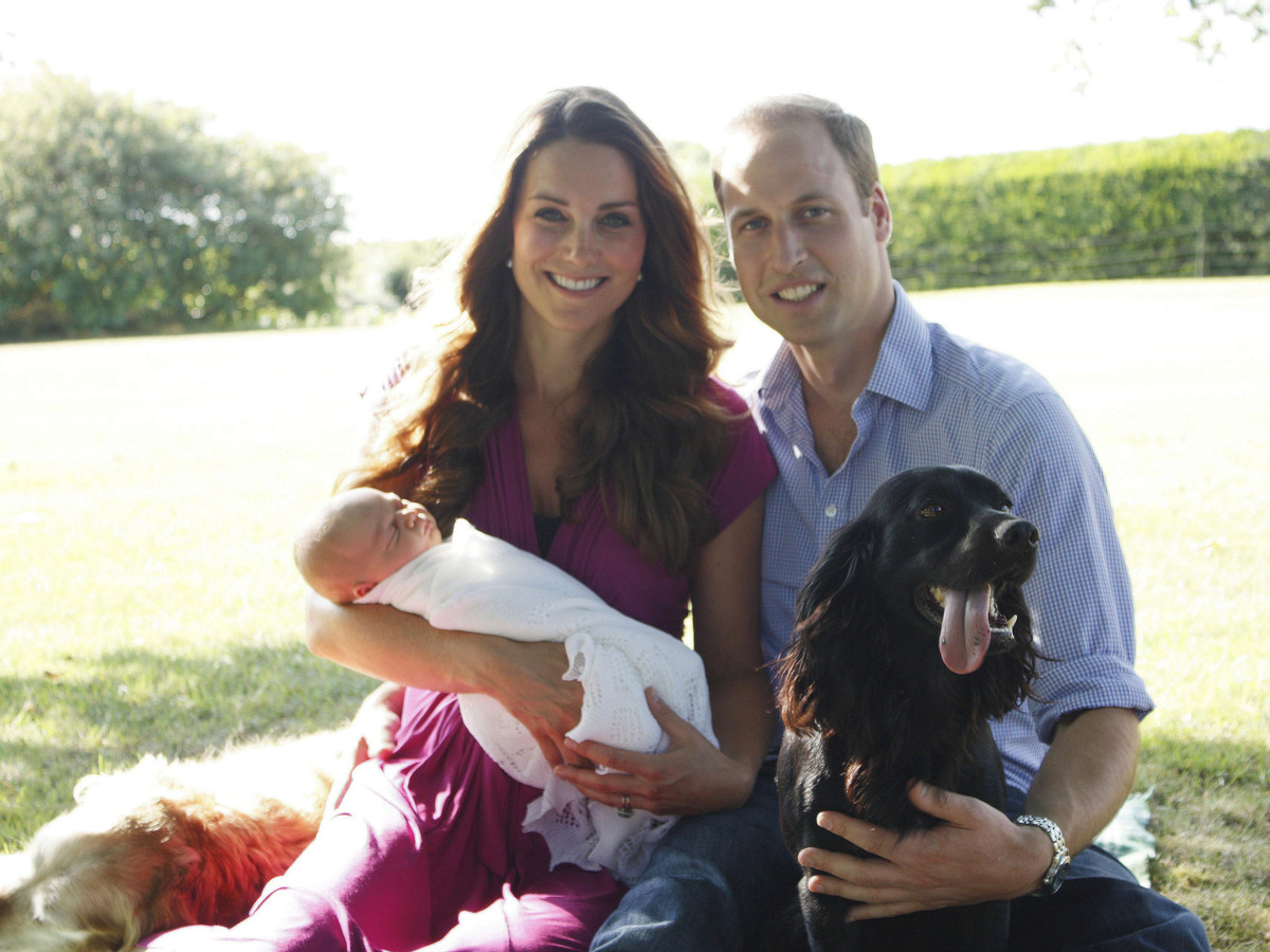 "Royal officials on Tuesday released photos of Kate holding the swaddled baby while standing beside William — and in one image, the couple's cocker spaniel, Lupo, [and retriever, Tilly]. The pictures were taken by Kate's father, Michael Middleton, in the family's backyard. The casual images are a departure from the royal tradition of hiring professional photographers for baby portraits."