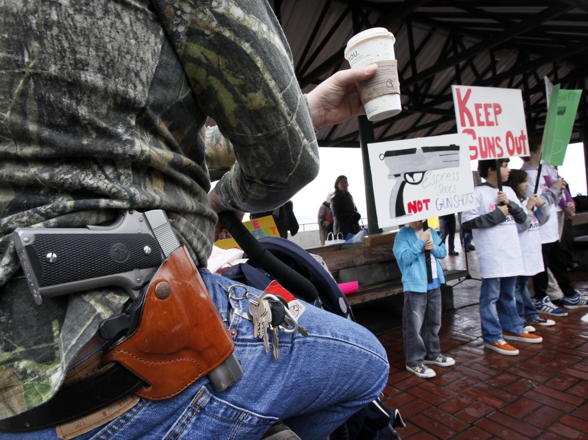A Starbucks customer — gun on his hip and drink in his hand — watches a rally by gun control advocates, in Seattle in 2010.