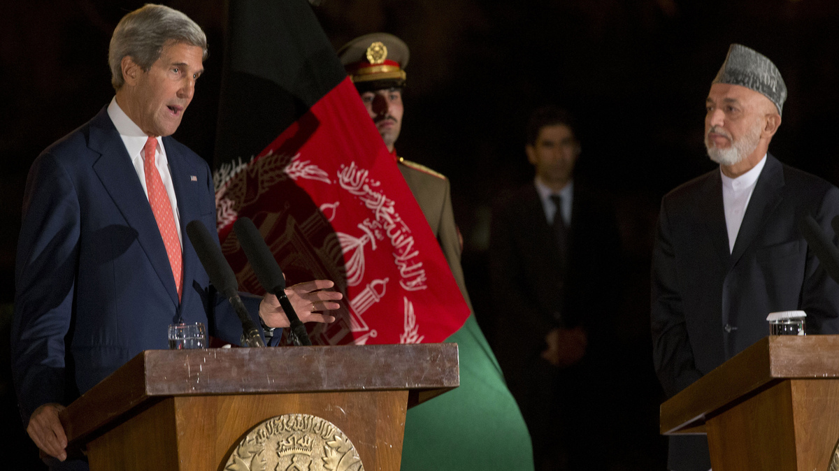 Secretary of State John Kerry describes a new partial bilateral security agreement with Afghanistan, in a news conference held Saturday after hours of discussions with Afghan President Hamid Karzai, right. AFP/AFP/Getty Images hide caption
