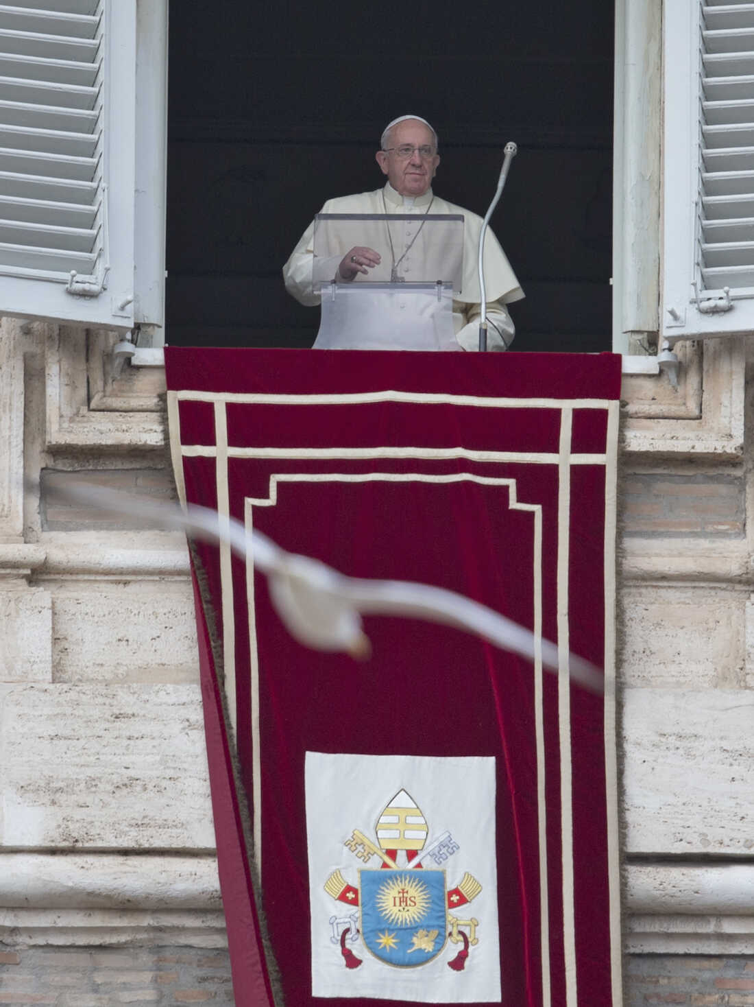 Pope Francis arrives for the Angelus noon prayer Sunday, during which he announced he would travel to Israel, the West Bank and Jordan on May 24-26. It would be Francis' first visit to the Holy Land. Alessandra Tarantino/AP hide caption