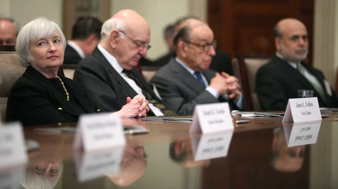 The Senate has approved Janet Yellen as the next head of the Federal Reserve. At a ceremony commemorating the Fed's centennial last month, Yellen sat with (from left-to-right) former chairmen Paul Volker and Alan Greenspan, and current Fed leader Ben Bernanke. Mark Wilson/Getty Images hide caption