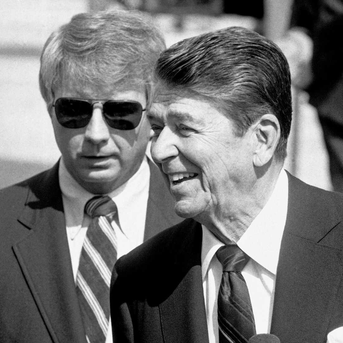 Larry Speakes, left, and President Ronald Reagan in a 1984 appearance on the White House South Lawn. Ira Schwarz/AP hide caption