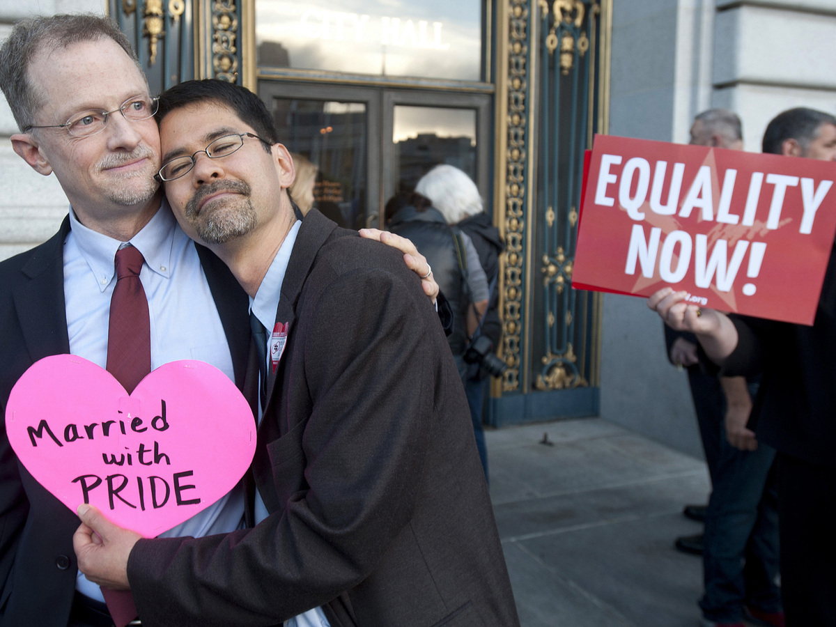 John Lewis (left) and Stuart Gaffney embrace outside San Francisco's City Hall shortly before the U.S. Supreme Court ruling cleared the way for same-sex marriage in California in June.