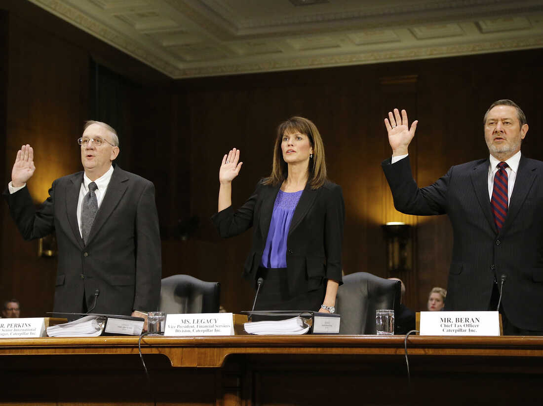 Caterpillar Inc Vice President for Finance Services Julie Lagacy is flanked by former Senior International Tax Manager Rodney Perkins (left) and Chief Tax Officer Robin Beran (right) as they are sworn in to testify on Tuesday. Jonathan Ernst/Reuters/Landov hide caption