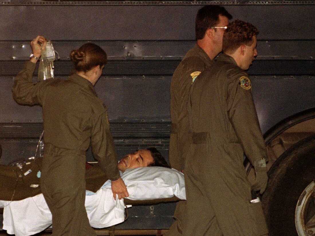 Chief Warrant Officer Michael Durant, wounded when the helicopter he was piloting was shot down in Somalia, arrives at Andrews Air Force Base in Maryland, on Oct. 16, 1993. He was held captive for 11 days. Joe Marquette/AP hide caption