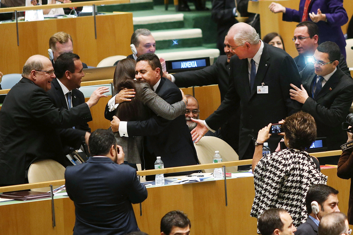U.N. representatives for Venezuela, including Foreign Minister Rafael Ramirez, right, celebrate after being elected to a two year term as a non-permanent member of the United Nations Security Council on Thursday.