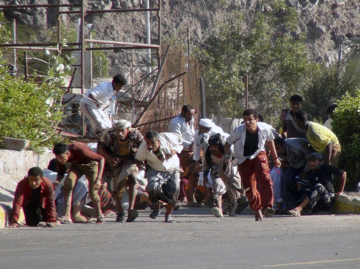 People seek shelter amid gunfire at an army base in Yemen's southern port city of Aden on Wednesday.