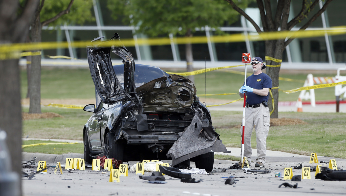 An FBI crime scene investigator documents evidence outside the Curtis Culwell Center on Monday in Garland, Texas. Brandon Wade/AP hide caption
