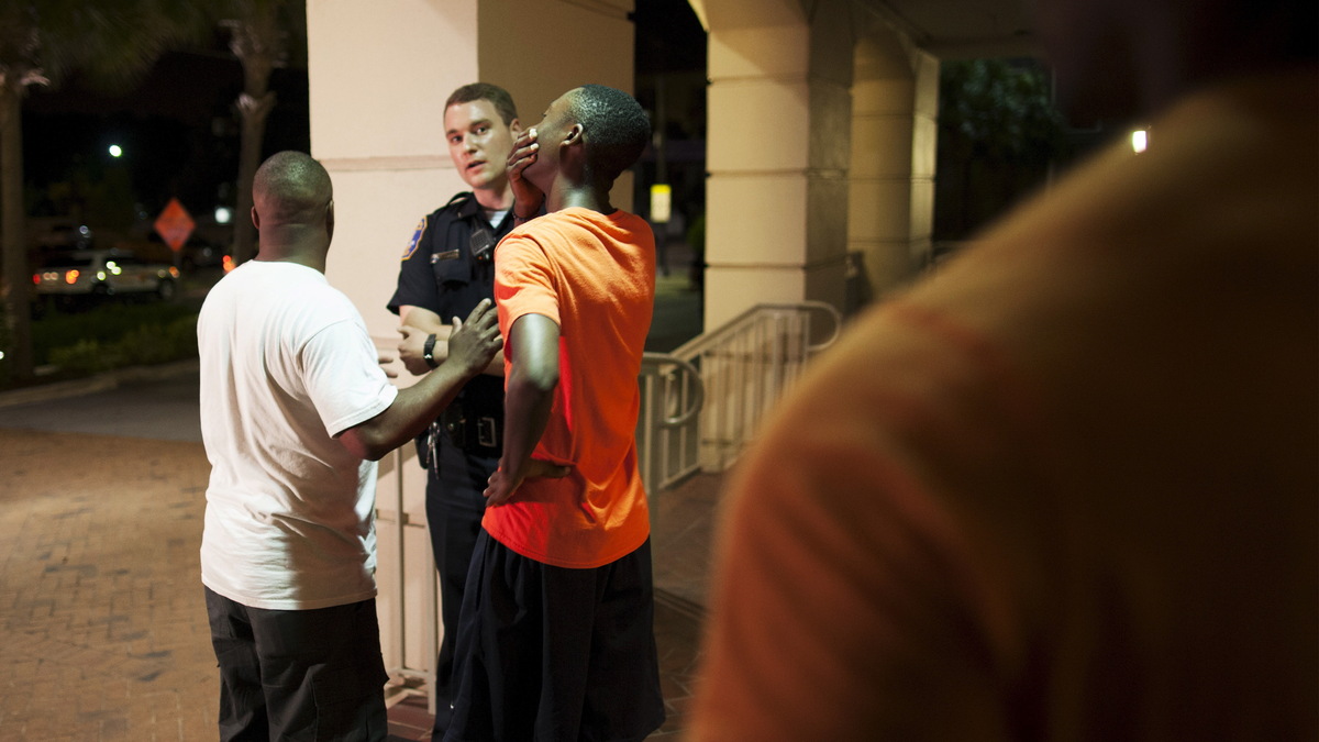 A man reacts while talking to police officer Wednesday night near the scene of shooting at the Emanuel AME Church in Charleston, S.C.