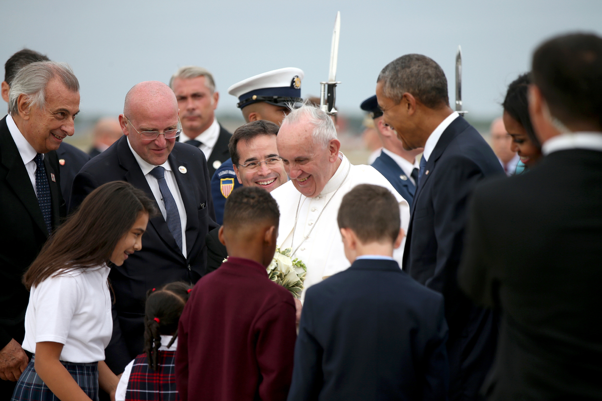 Pope Francis, accompanied by President Barack Obama and others, is greeted upon his arrival at Andrews Air Force Base, Md.