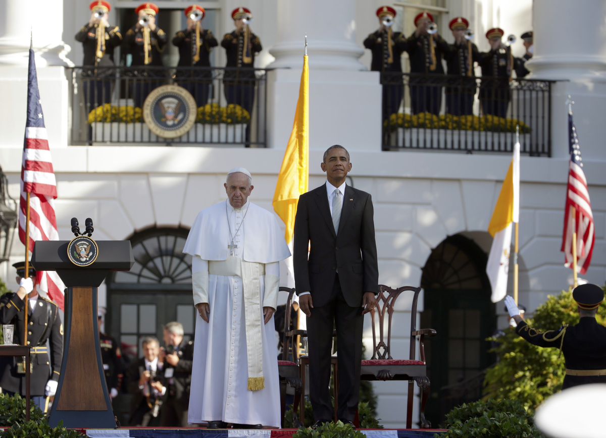 President Barack Obama and Pope Francis stand at attention during the playing of the national anthems during a state arrival ceremony for the pope on the South Lawn of the White House Wednesday.