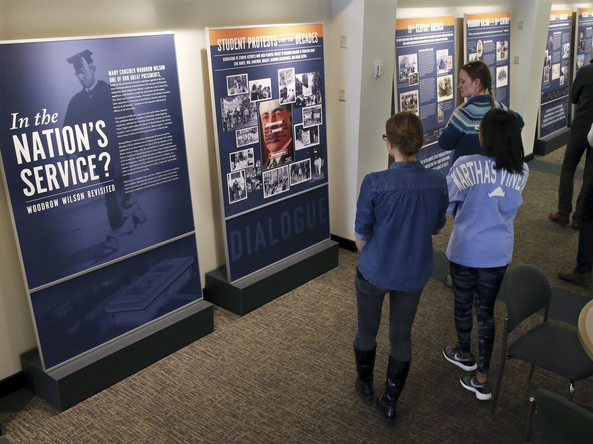 Princeton University students walk through an exhibit titled "In the Nation's Service? Woodrow Wilson Revisited," at the Woodrow Wilson School of Public and International Affairs in Princeton, N.J.