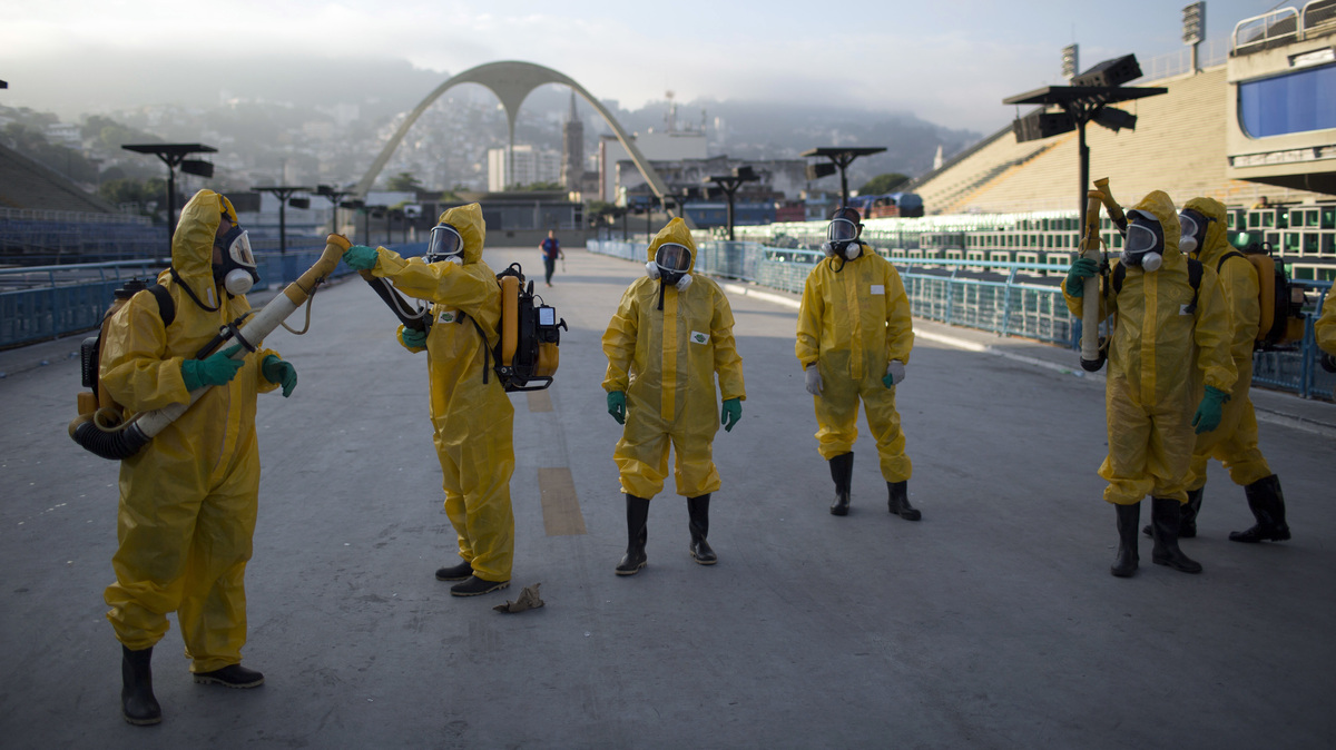Health workers get ready to spray insecticide to combat the Aedes aegypti mosquitoes that transmits the Zika virus in January, under the bleachers of the Sambadrome in Rio de Janeiro, which will be used for the Archery competition in the 2016 summer games. Leo Correa/AP hide caption