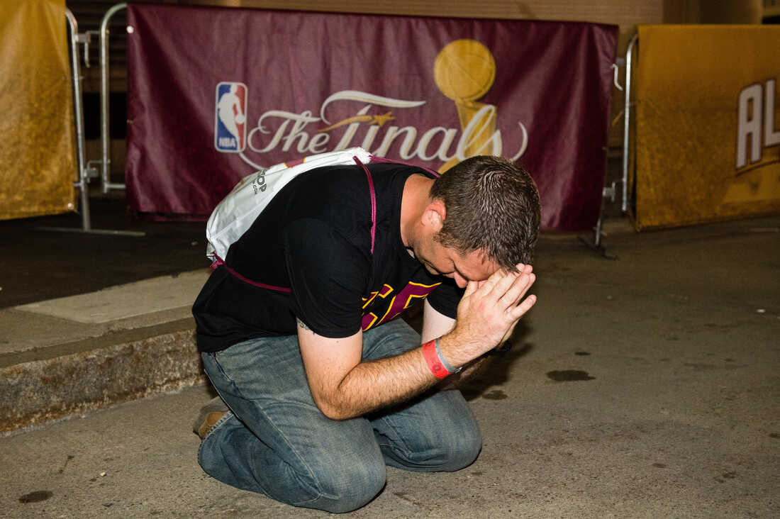 Cleveland fan Brian Wilson says a prayer during the final seconds of the game at the Cleveland Cavaliers NBA Finals Game Seven watch party at Quicken Loans Arena. Jason Miller/Getty Images hide caption