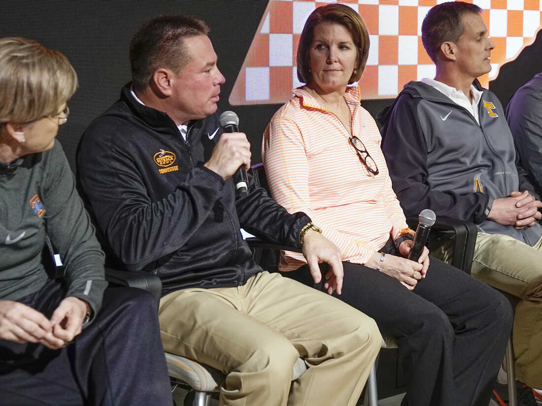 University of Tennessee coaches, including had football coach Butch Jones (second from left) hold a news conference in February. A federal lawsuit accused Tennessee of violating federal regulations and creating "a hostile sexual environment."