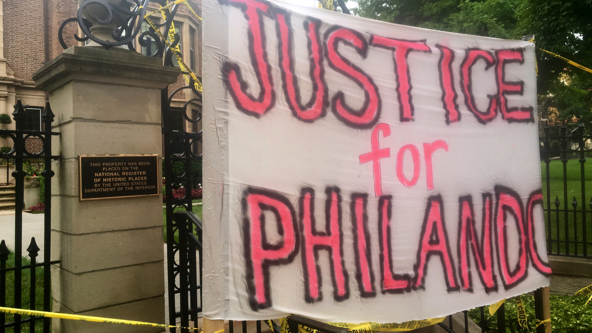 A sign is hung outside the Minnesota Governor's Residence as about 200 people gathered in St. Paul on Thursday, protesting the fatal shooting of Philando Castile by a suburban police officer. Jeff Baenen/AP hide caption
