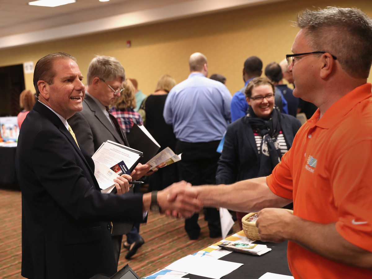 A man speaks with a potential employer Sept. 13 at a job fair in Hartford, Conn. Recent wage gains reflect the steady healing of the labor market since the worst of the Great Recession. John Moore/Getty Images hide caption
