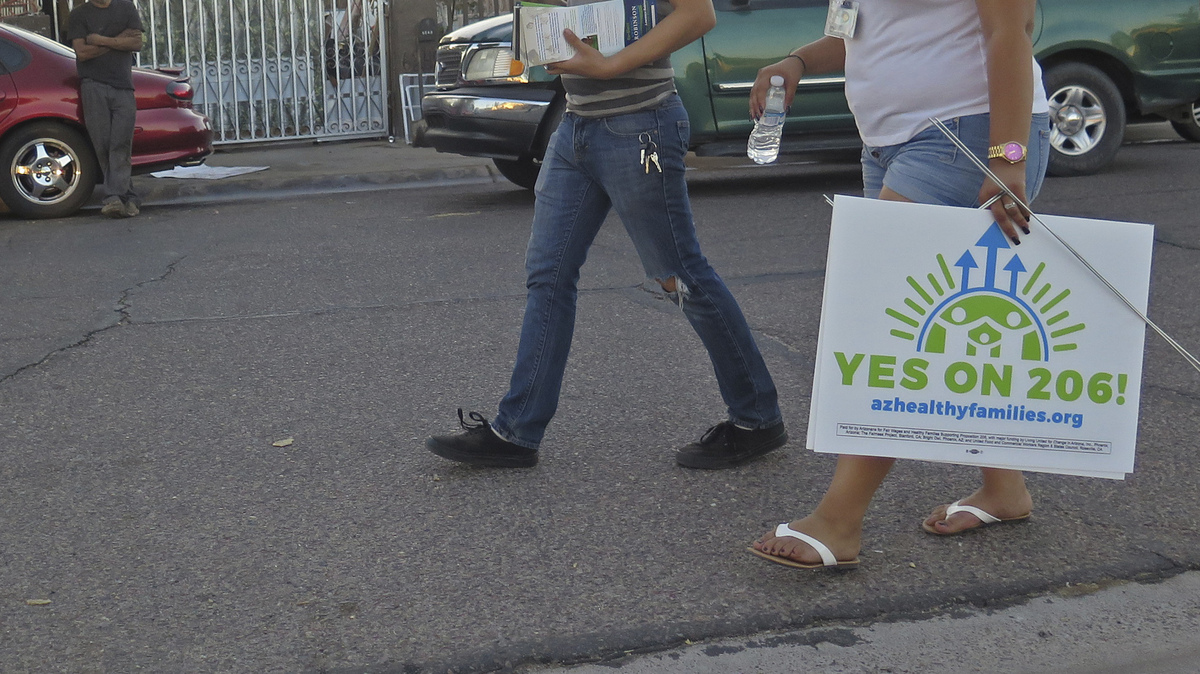 Workers with the Living United for Change in Arizona organization canvas a south Phoenix neighborhood in October to advocate for the passage of Proposition 206, which would increase the state's minimum wage. The measure was approved on Tuesday.