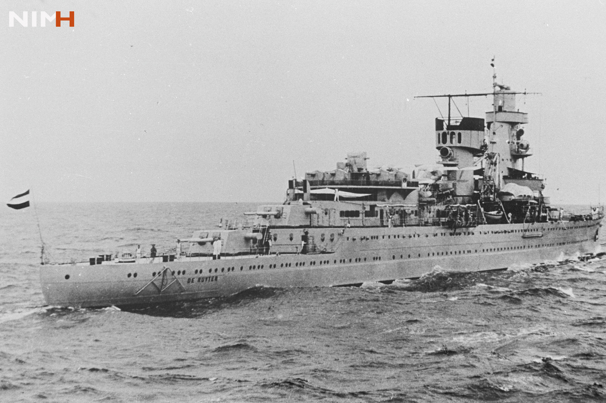 HNLMS De Ruyter before it sank in 1942. Netherlands Institute of Military History hide caption