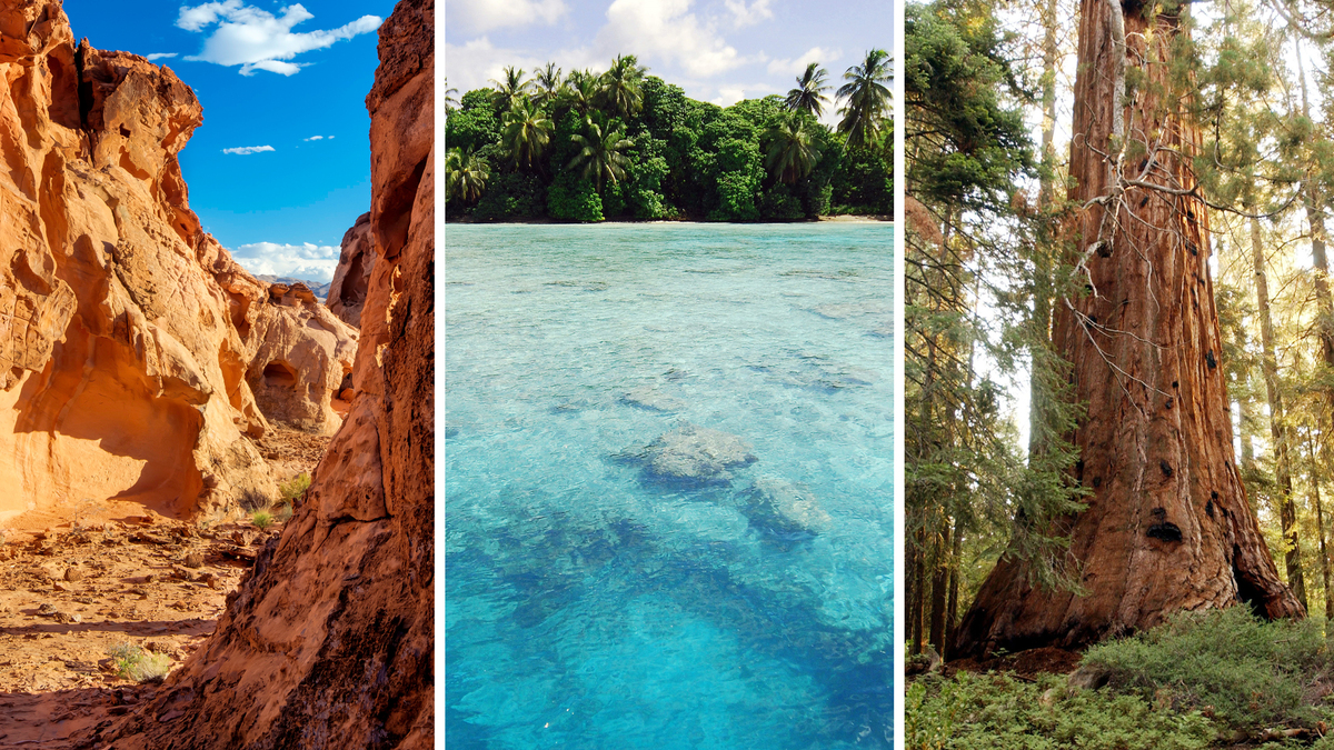 Three of the national monuments now under review by the Department of the Interior: (from left to right) Gold Butte in Nevada, the Pacific Remote Islands and Giant Sequoia in Northern California. Bureau of Land Management/Flickr; U.S. Fish and Wildlife Service/Flickr; David McNew/Getty Images hide caption