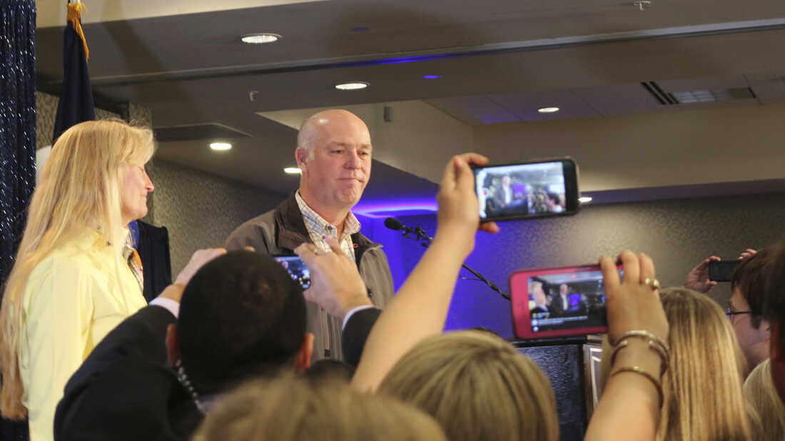 Republican Greg Gianforte greets supporters after winning a special election for the House from Montana last month. He apologized then and now has apologized in writing for assaulting a reporter. Bobby Caina Calvan/AP hide caption