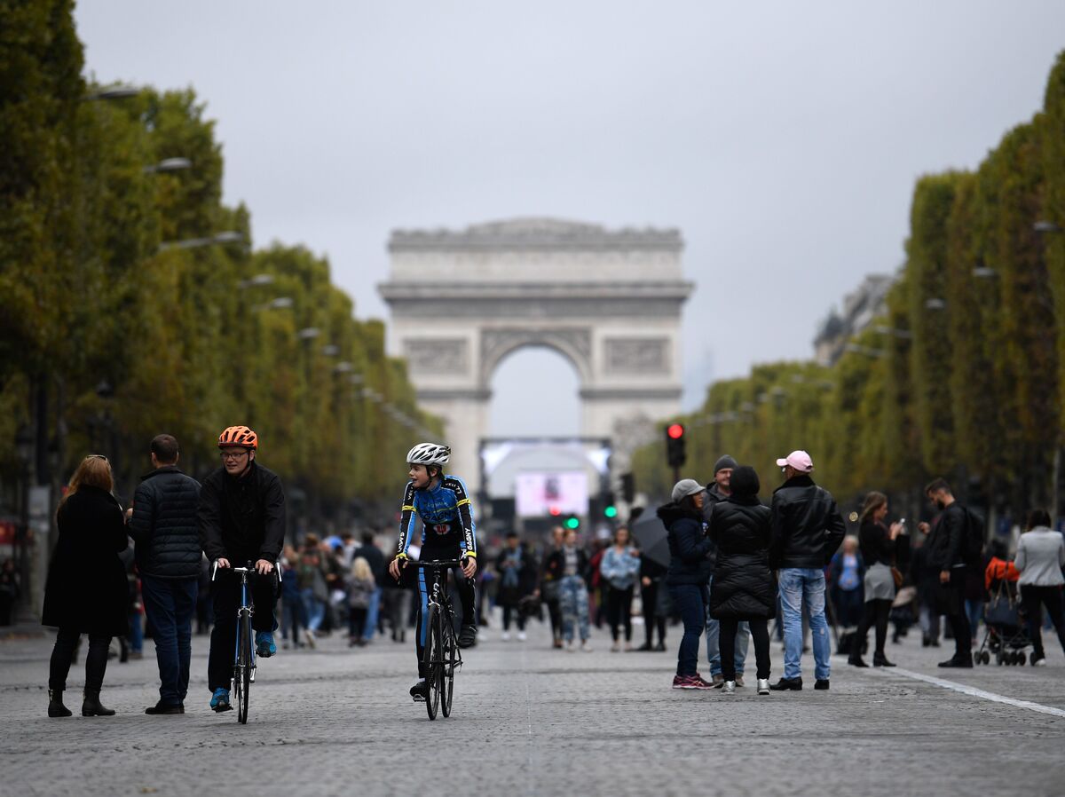 Mayor Anne Hidalgo has called for an end to gas-powered vehicles in Paris by 2030, in favor of biking, transit, and electric cars. Here, cyclists and pedestrians on the Champs- Élysées during the city's "day without cars" on Oct. 1.
