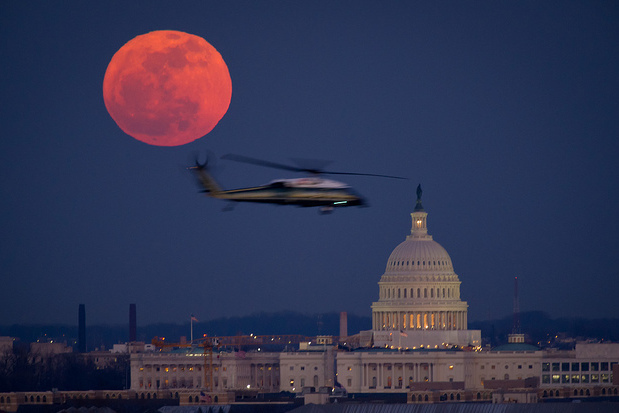 A U.S. Marine Corps helicopter flies through NASA photographer Bill Ingalls' supermoon composition in 2012.