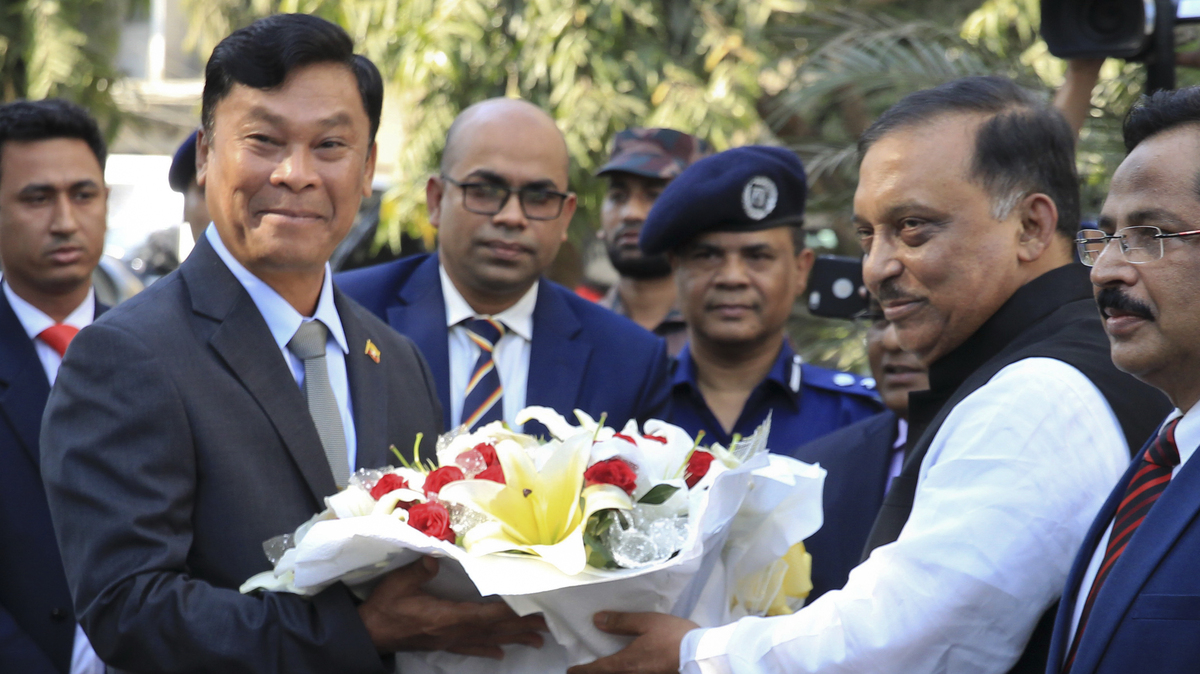 Bangladesh's Home Minister Asaduzzaman Khan (second from right) receives Myanmar's Home Minister Kyaw Swe (second from left) in Dhaka on Feb. 16. A human rights report criticizes Myanmar's treatment of Rohingya Muslims. But in presenting the findings, Amnesty officials called Bangladesh's acceptance of the Rohingya refugees, a rare bright light in a year of worsening human rights violations.