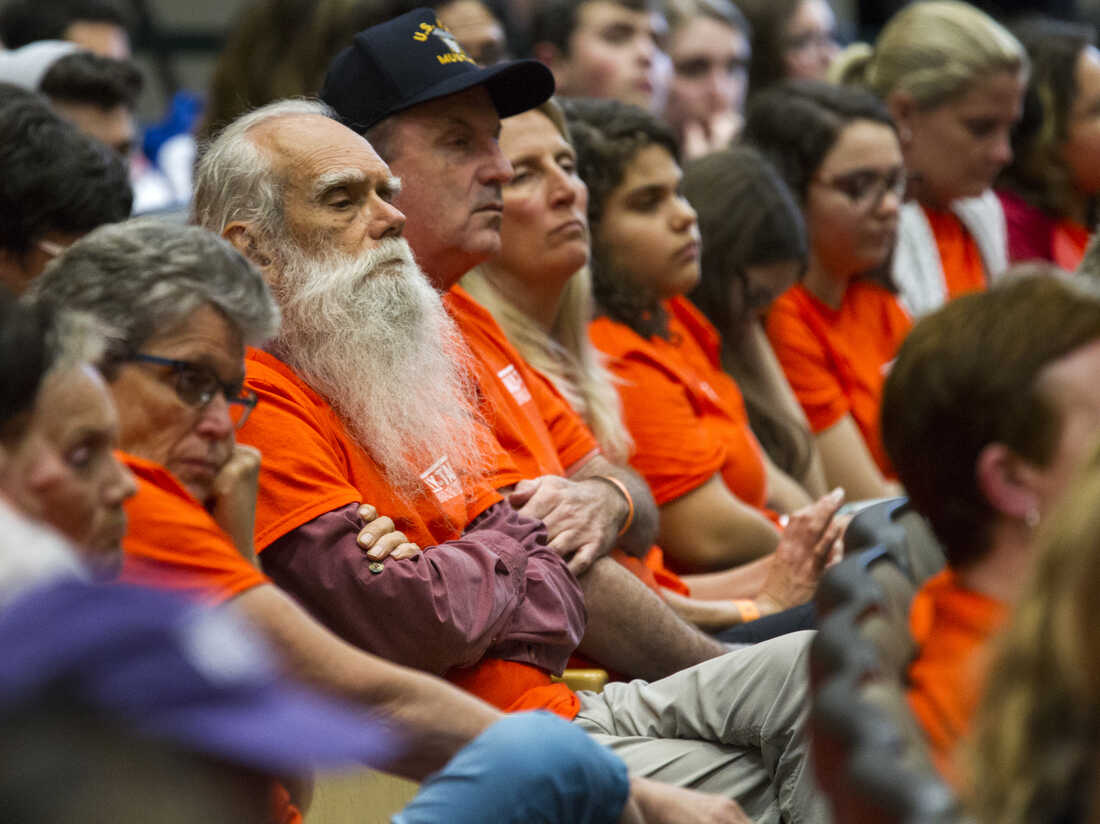 Protesters listen during the Senate Rules Committee meeting on gun safety at the state Capitol in Tallahassee, Fla. Mark Wallheiser/AP hide caption