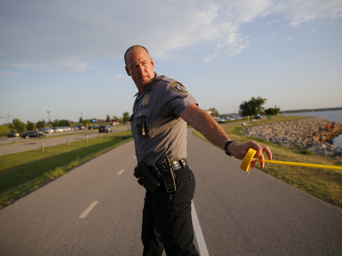 A police officer cordons off the scene of a Thursday night shooting at Louie's Grill & Bar in Oklahoma City.