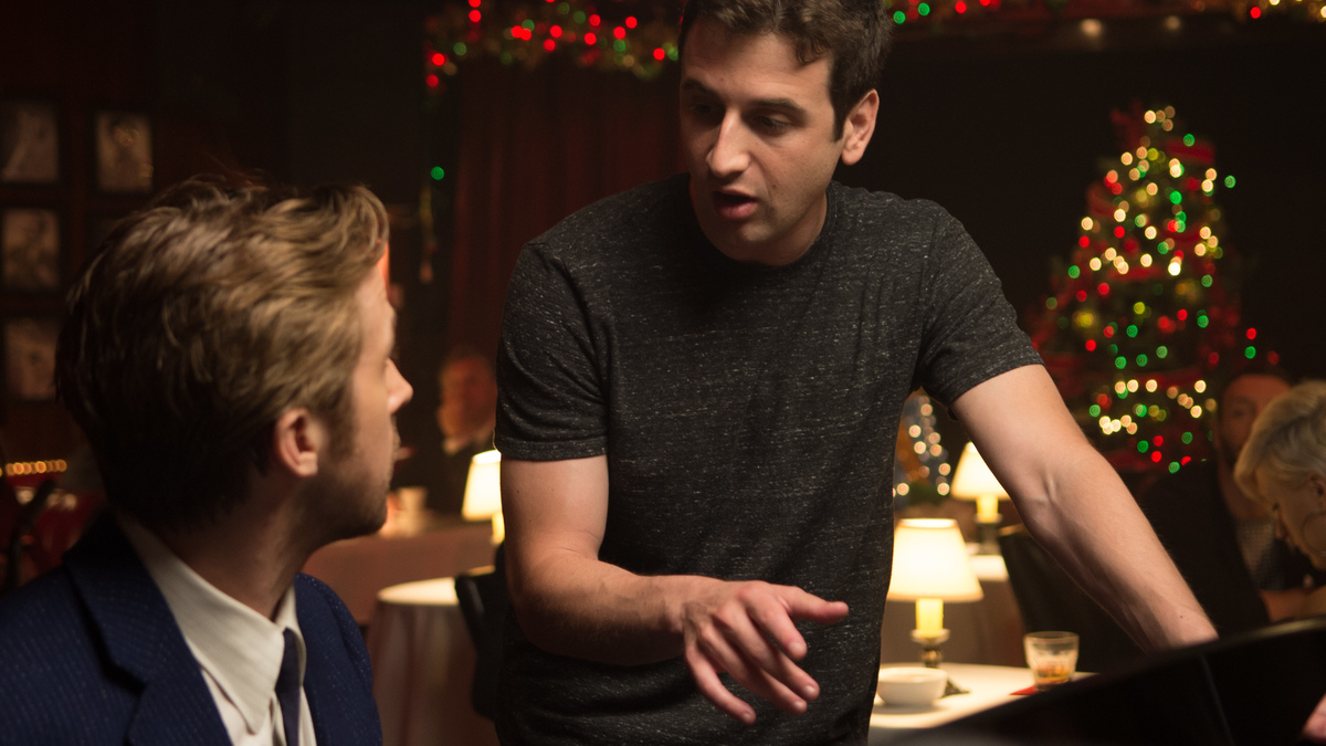 La La Land composer Justin Hurwitz on set with star Ryan Gosling.