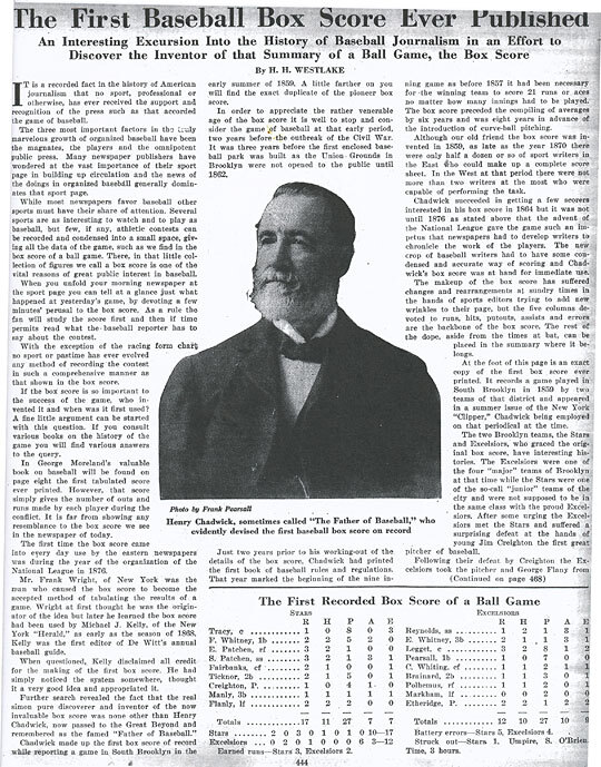 The idea of the 1859 box score being the first really gained momentum when a 1925 edition of Baseball Magazine reprinted Chadwick's New York Clipper article. It is perhaps useful to think of the box score as having evolved like a species.